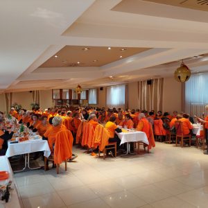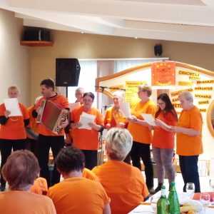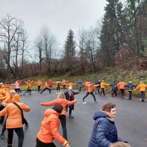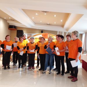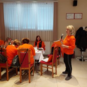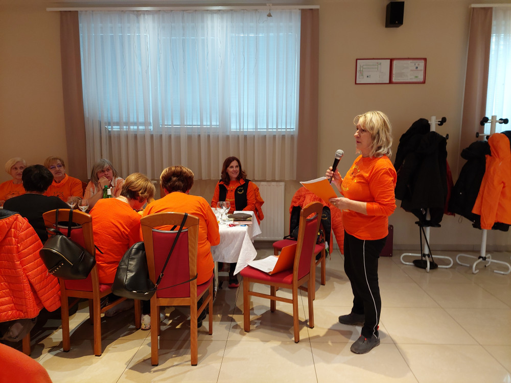 Najprej smo se na parkirišču razmigali z metodo »1000 gibov,« ki jo je vodila predsednica Zdenka Kavčič. Nato smo se preselili v gostišče, kjer sta nas toplo nagovorili organizatorka srečanja Lidija in predsednica društva Zdenka.