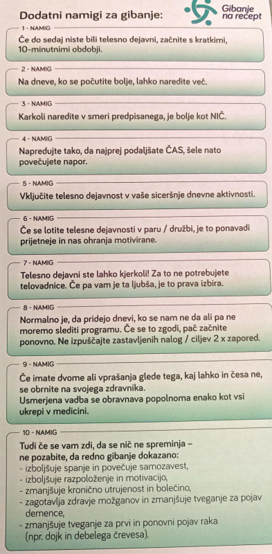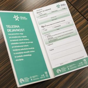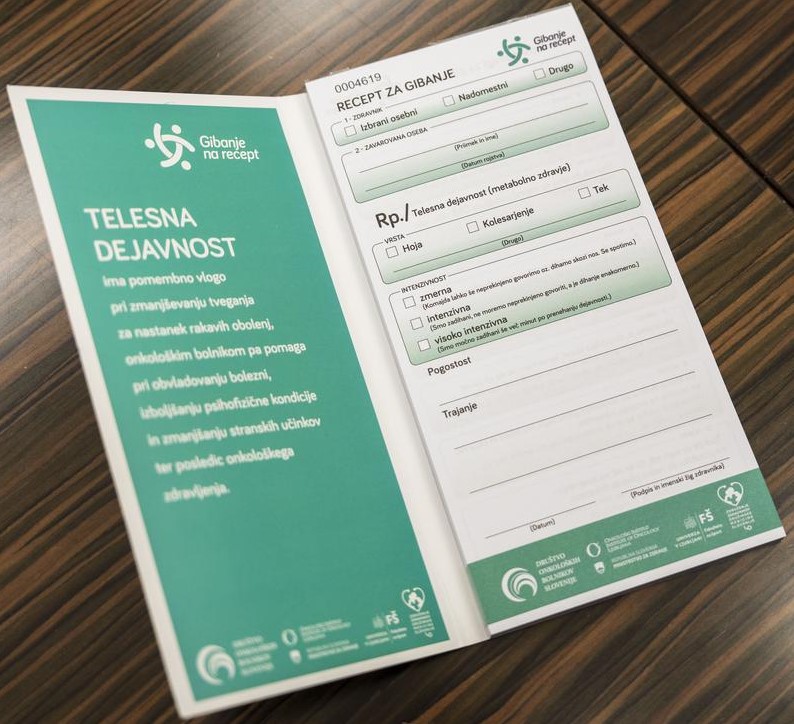 Zdaj pa se to končno uresničuje. Družinski zdravniki bodo po novem lahko svojim pacientom predpisali Zeleni recept za gibanje! Gre za slovenski projekt »Gibanje na recept«, ki so ga oblikovali Društvo onkoloških bolnikov Slovenije, Onkološki inštitut Ljubljana, Združenje zdravnikov družinske medicine Slovenije, Fakulteta za šport Univerze v Ljubljani in Ministrstvo za zdravje. Namen tega projekta je spodbuditi tako telesno nedejavne kot bolnike, (tudi onkološke, med okrevanjem) k rednemu gibanju. Oštevilčeni recepti bodo dostopni vsem zdravnikom v splošnih ambulantah, da bodo lahko pacientom dali pisni nasvet o navedeni telesni aktivnosti (hojo, kolesarjenje ali tek). Zdravnik lahko predpiše ne le obliko gibanja, ampak tudi intenziteto, pogostost in pa trajanje vadbe.