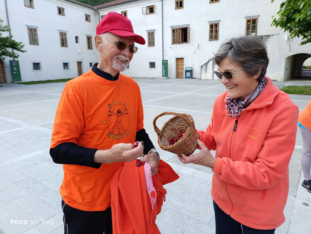 Vse udeleženke smo test opravile odlično z nadpovprečnimi rezultati za svoja leta. To pravzaprav ni tako čudno, saj vsak dan pridno telovadimo, danes pa je naša udeleženka Boža poskrbela še za dodatno motivacijo s košarico češenj. Še posebej sta jih bila vesela naša današnja gosta iz skupine Dobova, ki se nam občasno pridružita, ko prideta na obisk k hčerki v Vipavo.