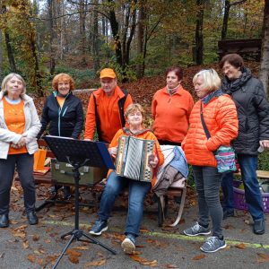 Prijetno druženje se je nadaljevalo ob domačem čaju, kavi, prigrizkih in sladkih pregrehah. Za še boljše vzdušje je poskrbela ga. Lojzka s svojo harmoniko. Kar hitro so se ji pridružili pevci in pevke in okolico je napolnilo ubrano petje.