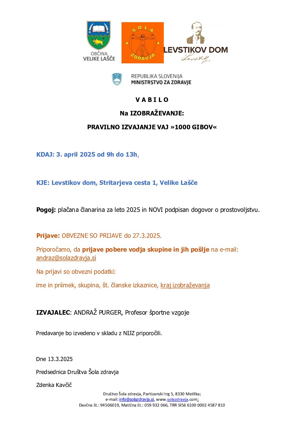 Usposabljanje: Pravilno izvajanje vaj "1000 gibov", Velike Lašče